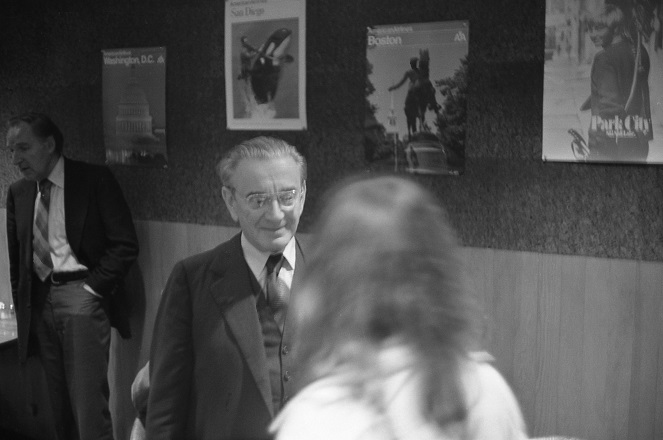 ▩ Rózsa talks to an unidentified fan. Behind him, Gerald Pratley.