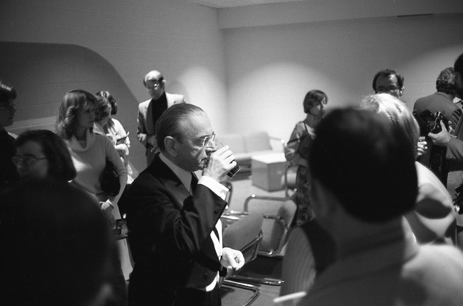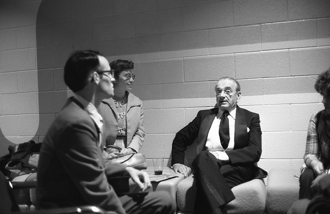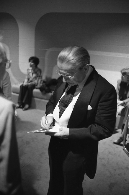 ▩ Rózsa is approached by unidentified fan as he enters the reception room after the concert. On the left: Mary Peatman, John Fitzpatrick, Mark Koldys. On the right: Vince Dorval.