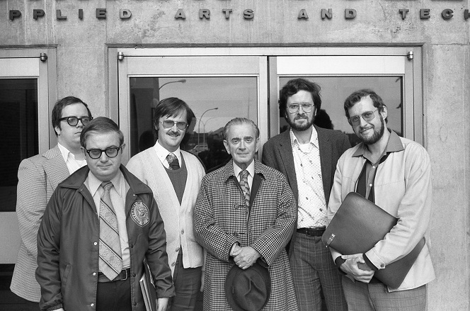 ▩ Outside the rehearsal hall. From left: Mark Koldys, Charles Rilegh, George Komar, Rózsa, Mike Quigley, Alan Hamer.