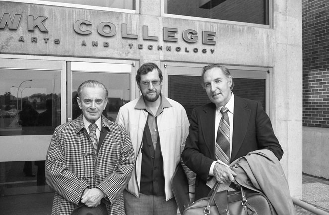 ▩ Outside the rehearsal hall. From left: Rózsa, Alan Hamer, Gerald Pratley of the Ontario Film Theatre.