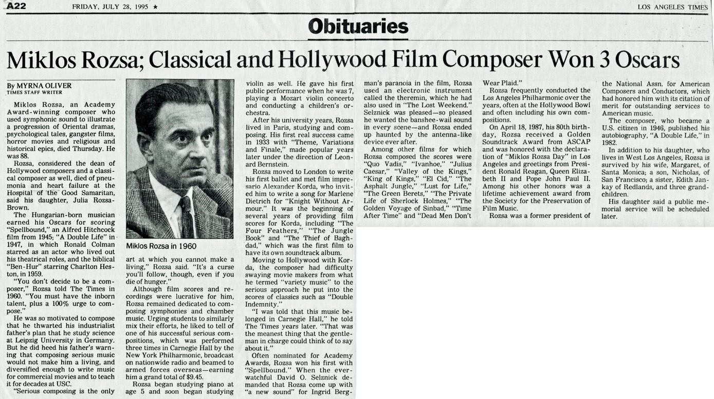 Miklós Rózsa, an Academy Award-winning composer who used symphonic sound to illustrate a progression of Oriental dramas, psychological tales, gangster films, horror movies and religious and historical epics, died Thursday. He was 88.Rózsa, considered the dean of Hollywood composers and a classical composer as well, died of pneumonia and heart failure at the Hospital of the Good Samaritan, said his daughter, Julia Rózsa-Brown.